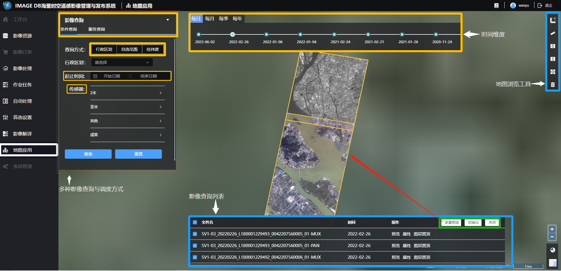 数据查询之时间查询、条件查询(行政区、绘制范围、经纬度)、组合查询(起止时间、传感器类型、分辨率),可勾选多景影像同时预览、查看属性、图层显示上下调换等。